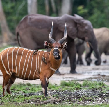 Visit to Dzanga Bai. Dzanga Bai is large mineral rich clearing in the middle of the rainforest where forest elephants gather in large numbers to indulge in drinking the mineral rich waters that bubble up in places in this Bai. The interaction between so many different groups of Forest elephants ensure that no one can ever get bored at this place, while the possibility of some of the other normally shy forest creature like Bongo, Giant Forest Hog, Red River Hog, Sitatunga and Forest Buffalos visiting the Bai keep us alert.